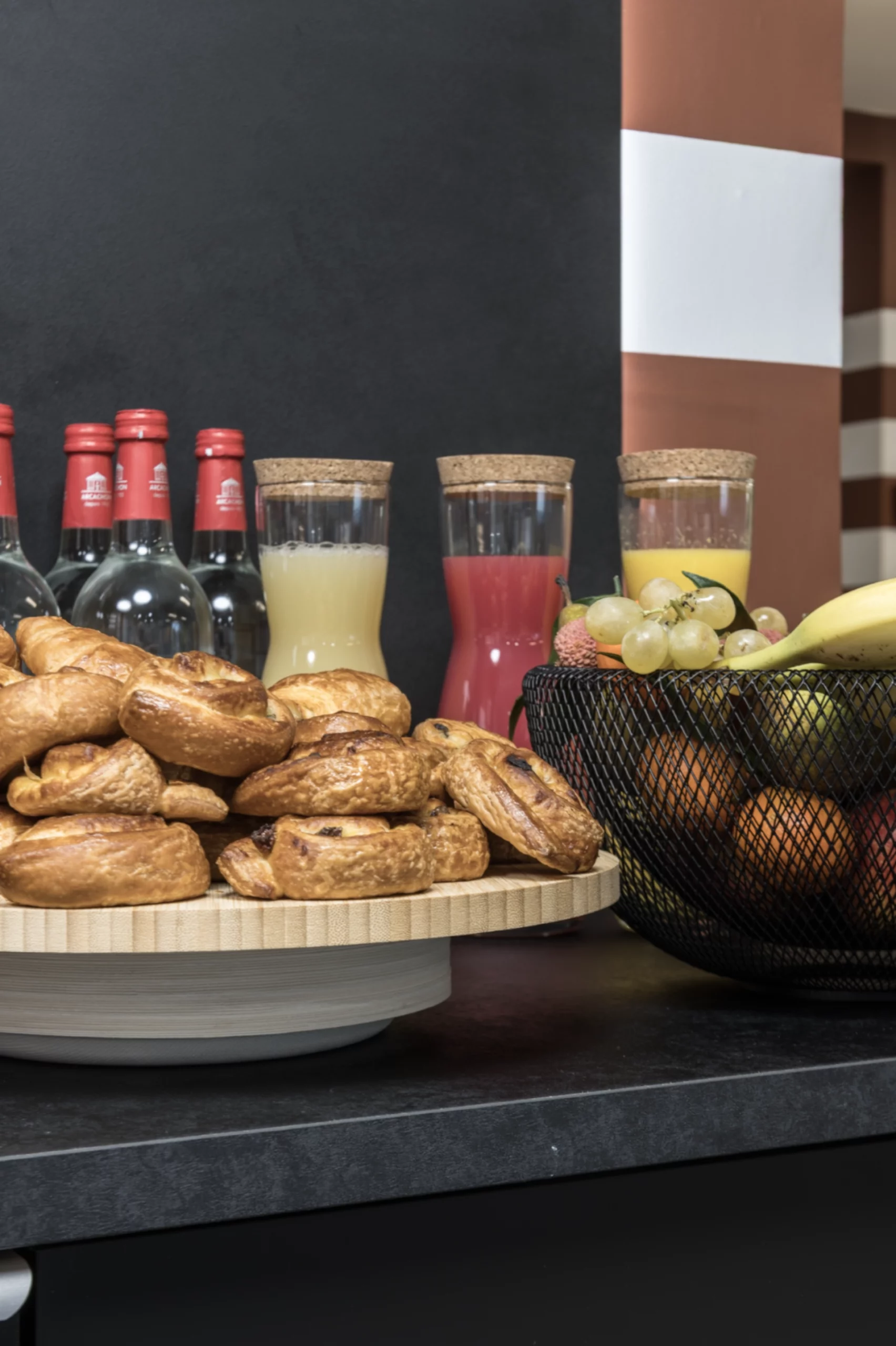 Café, assortiment de thé et d’infusion, eaux minérales plate et pétillante, jus de fruit frais, assortiment de viennoiseries